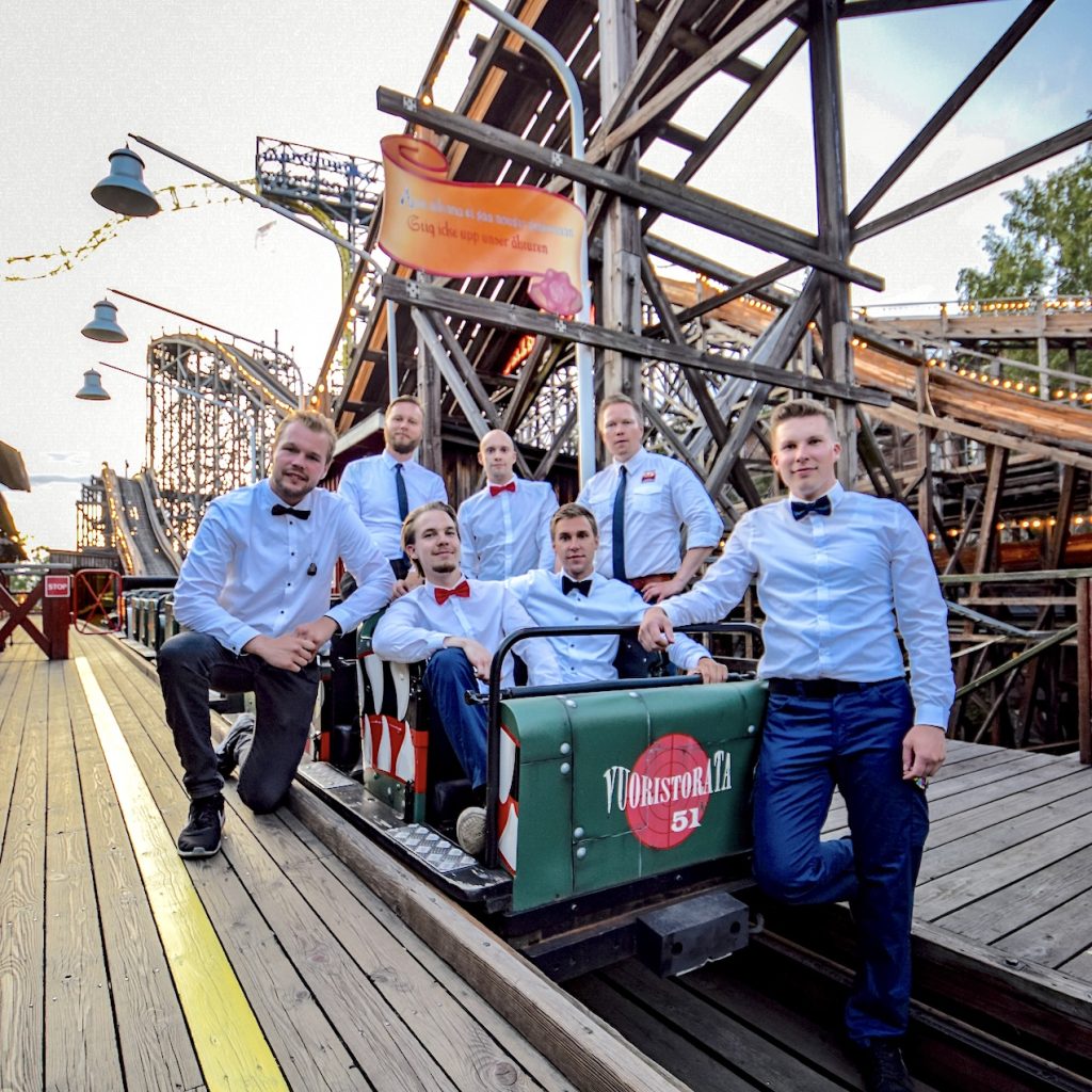 Jarrumiehet yhteispotretissa Vuoristoradan 60-vuotissyntymäpäivänä 13.7.2011. Kuvan jarrumiehillä on yhteensä 175 vuoden kokemus Vuoristoradan ajamisesta, joten asiakkaat olivat juhlapäivänäkin turvallisissa käsissä. Entisaikojen muistoksi päälle puettiin vanhan ajan jarrumiesten työasu eli kauluspaita ja kravatti.