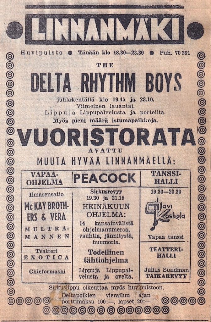 Linnanmäki mainosti Vuoristoradan avajaisviikonlopun ohjelmaa Helsingin Sanomissa lauantaina 14.7.1951.